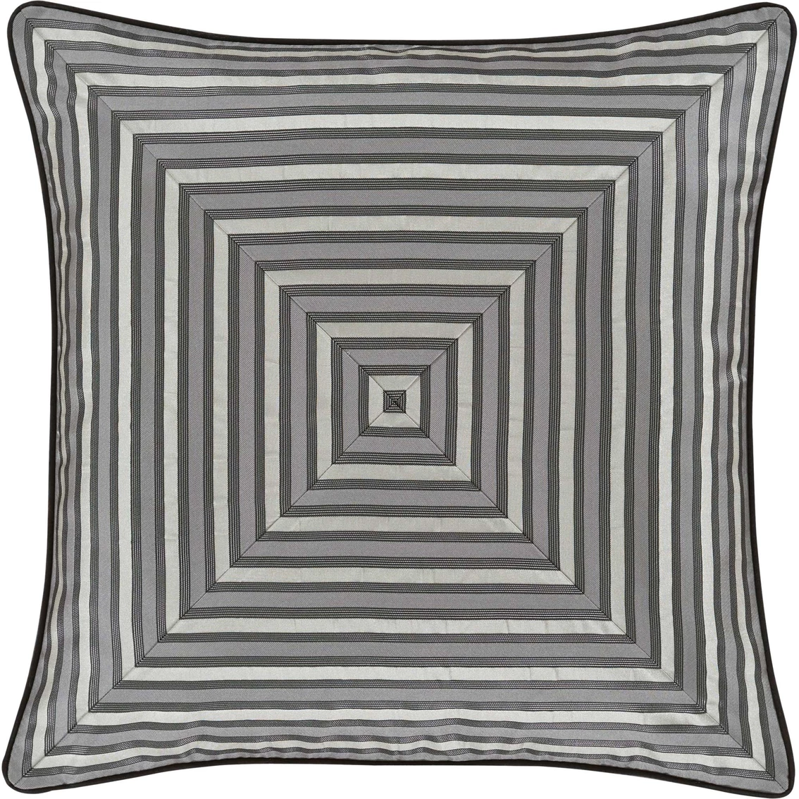 The Silverstone Euro Sham is beautifully engineered with a traditional silver and charcoal woven stripe mitered on the face. The reverse of this sophisticated pillow sham is a simple yet beautiful solid black faux silk with hidden zipper closure. This 26 in. Euro Sham is the perfect backdrop to this traditional collection. The pillow sham is reversible and is finished with a decadent 1/4 in. black piping. Pair this pillow sham with the Silverstone bedding set (sold separately) by Five Queens Court for a complete elegant look. Style: 2614046EURO.