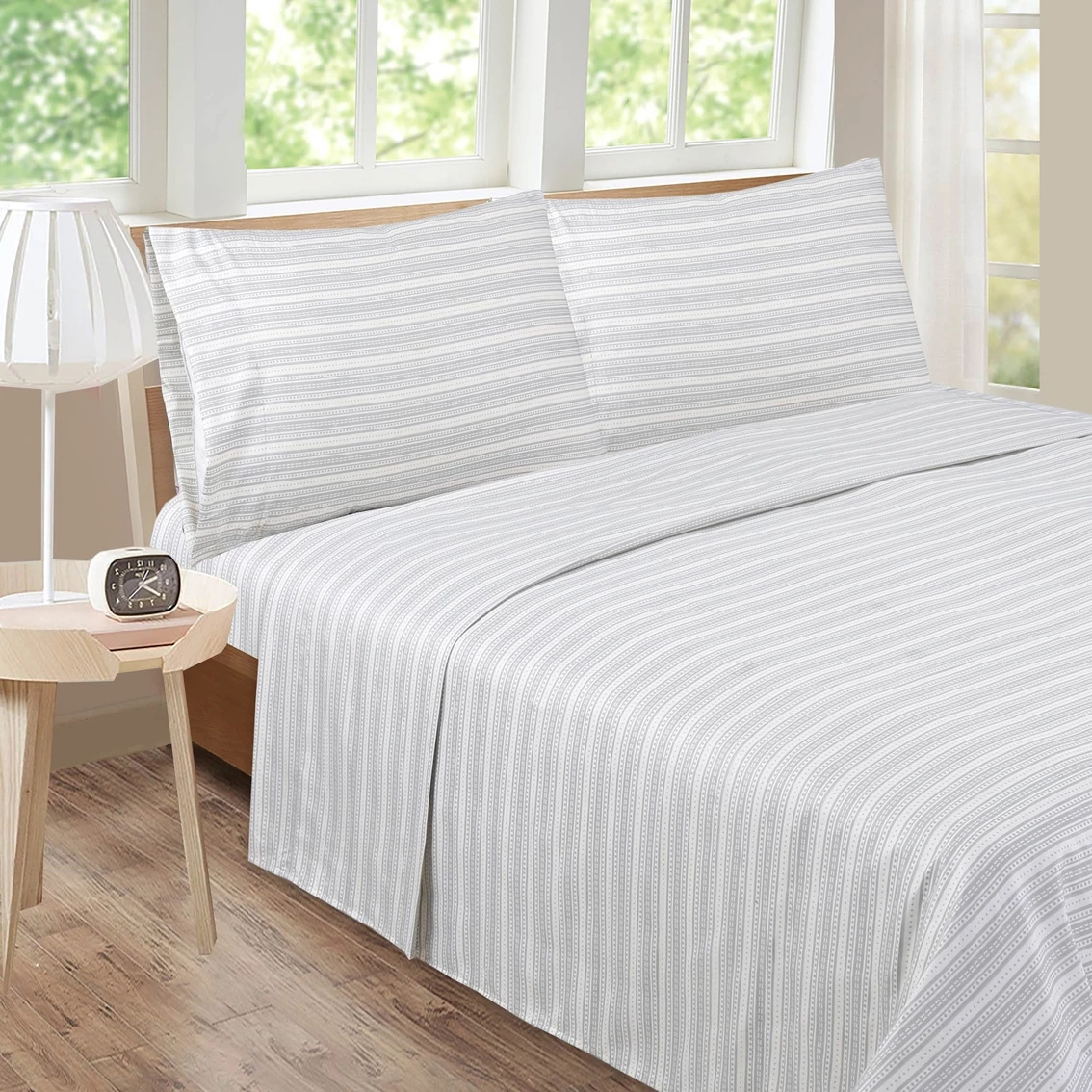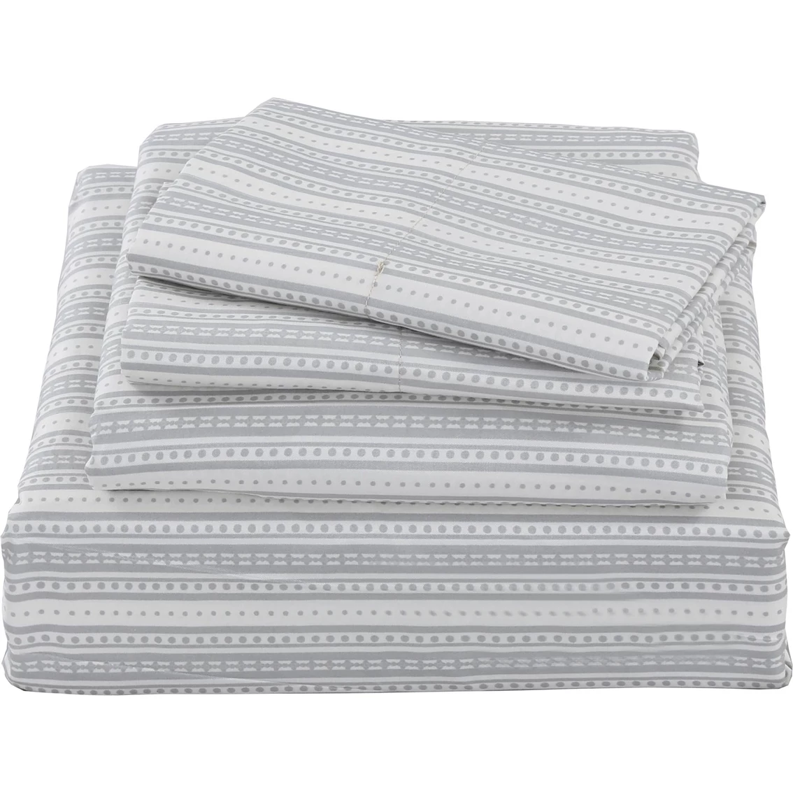Upgrade your bedroom esthetic, with this 4-piece Fairview Grey Stripe Sheet Set from Harper Lane. This printed motif will add life to any room. The set is printed on poly microfiber and includes one fitted sheet, one flat sheet, and two pillowcases. One pillowcase in twin size. Lightweight, fade resistant. All items are machine washable for easy care. Style: 17208.
