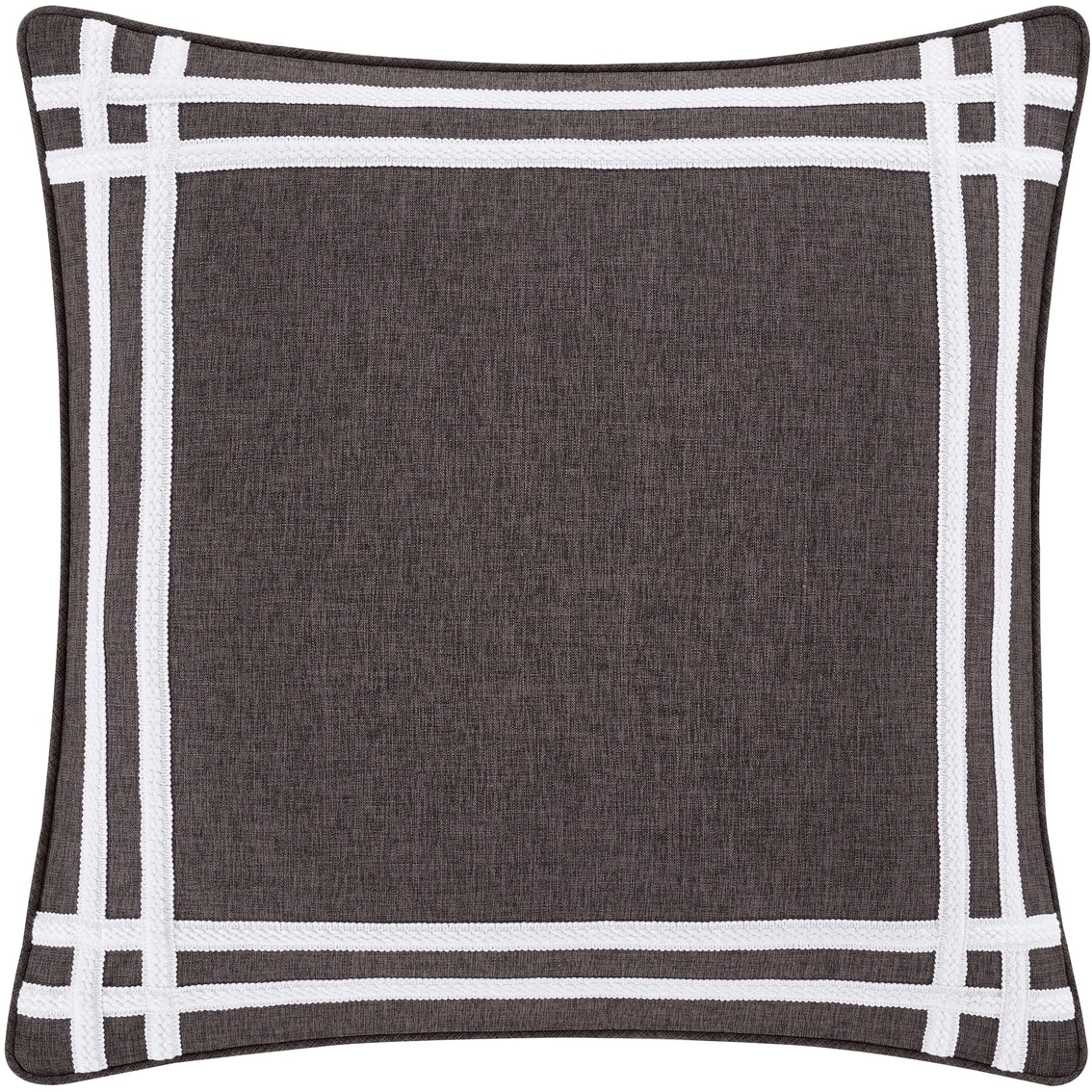 The J. Queen New York Euro sham has 2 rows of white gimp accents top-stitched on a heathered charcoal grey colored faux linen. The pillow sham reverses to a white color faux linen and is finished with 1/4 in. piping for added detail.