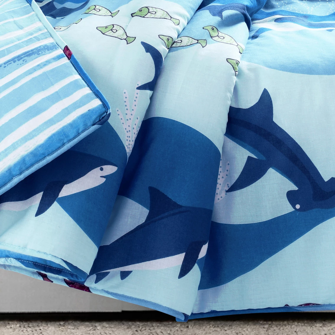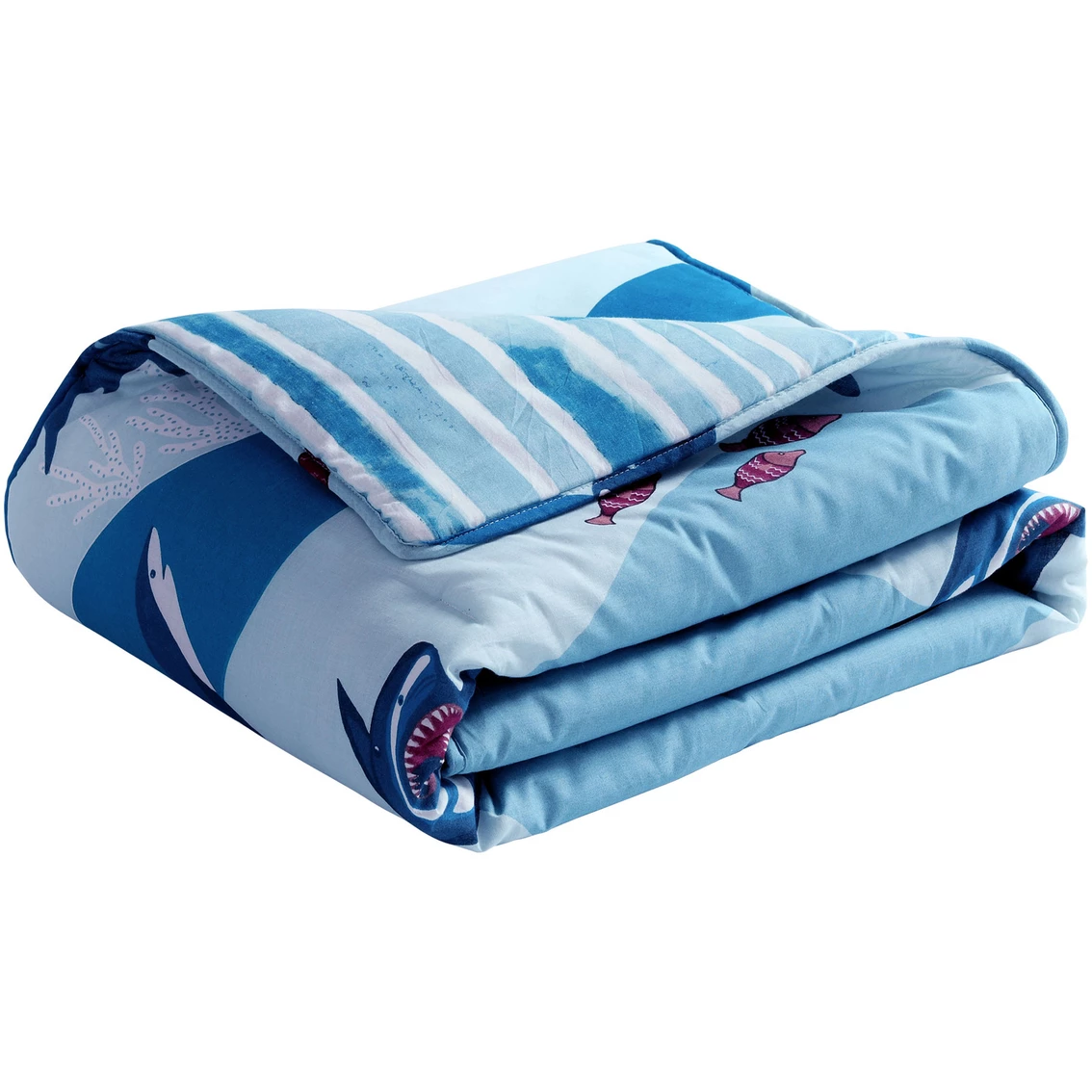 This reversible 50 in. X 60 in. Allover Shark Throw from Lush Decor is perfect for your son or daughter’s big kid bedroom or a spare bedroom in your beach house. The front design features various breeds of sharks printed on 100% cotton, and the reverse features a striped wave pattern. Style: 16T004841.