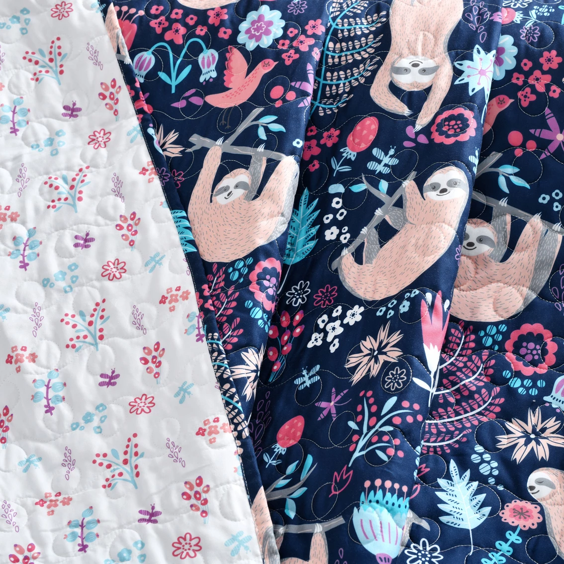 Update your child’s bedroom or your baby’s nursery with this adorable reversible 50 in. X 60 in. Hygge Sloth Throw from Lush Decor featuring sloths, birds, flowers and more printed on soft microfiber. The reverse side features a more subdued pattern of colorful flowers on a white background. Style: 16T004839.
