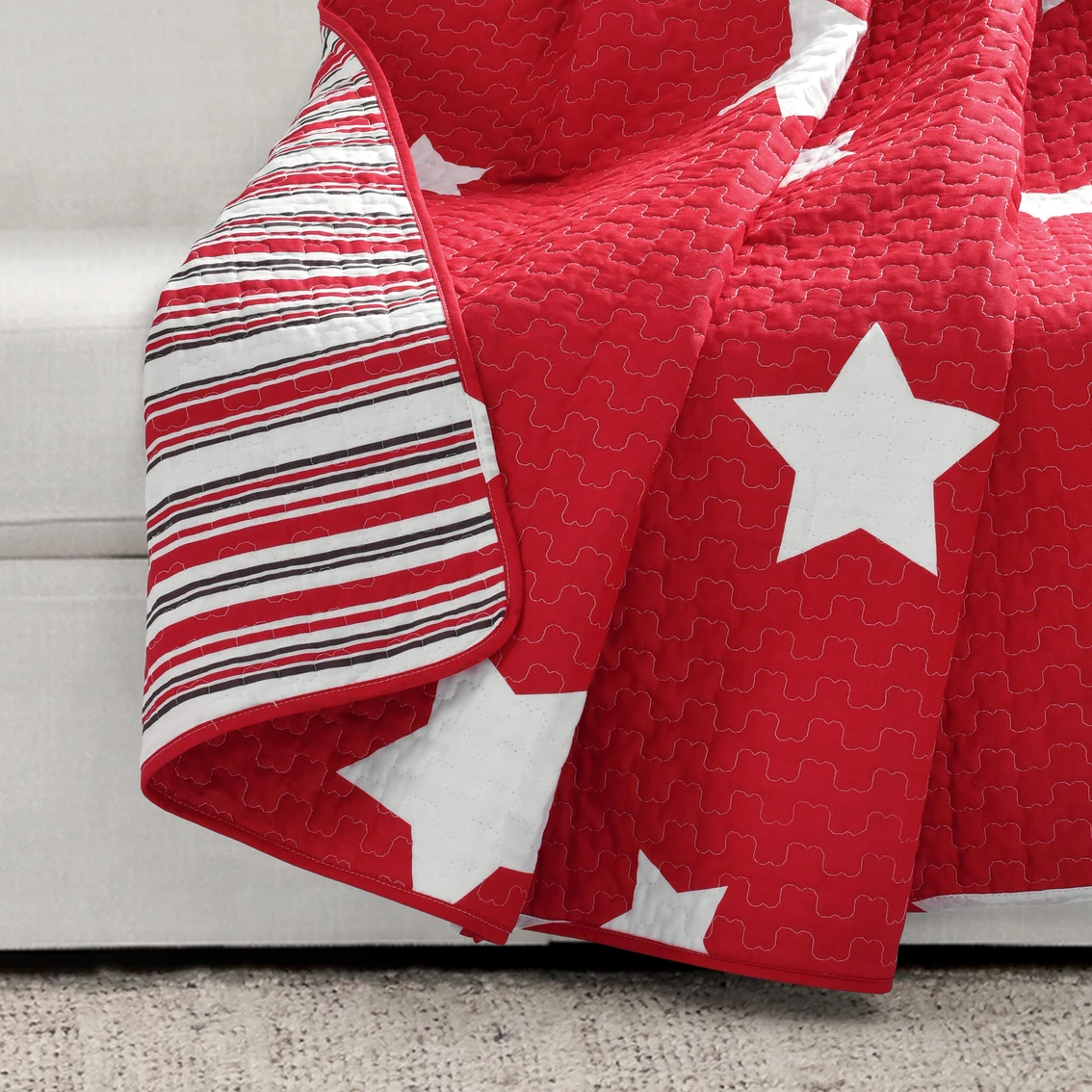 This Lush Decor reversible throw blanket is perfect for kids and adults of all ages. Give your bedroom or living room a patriotic update with bold stars printed on cotton on the front and stripes printed on the back. This throw measures 50 inches by 60 inches. Style: 16T004343.