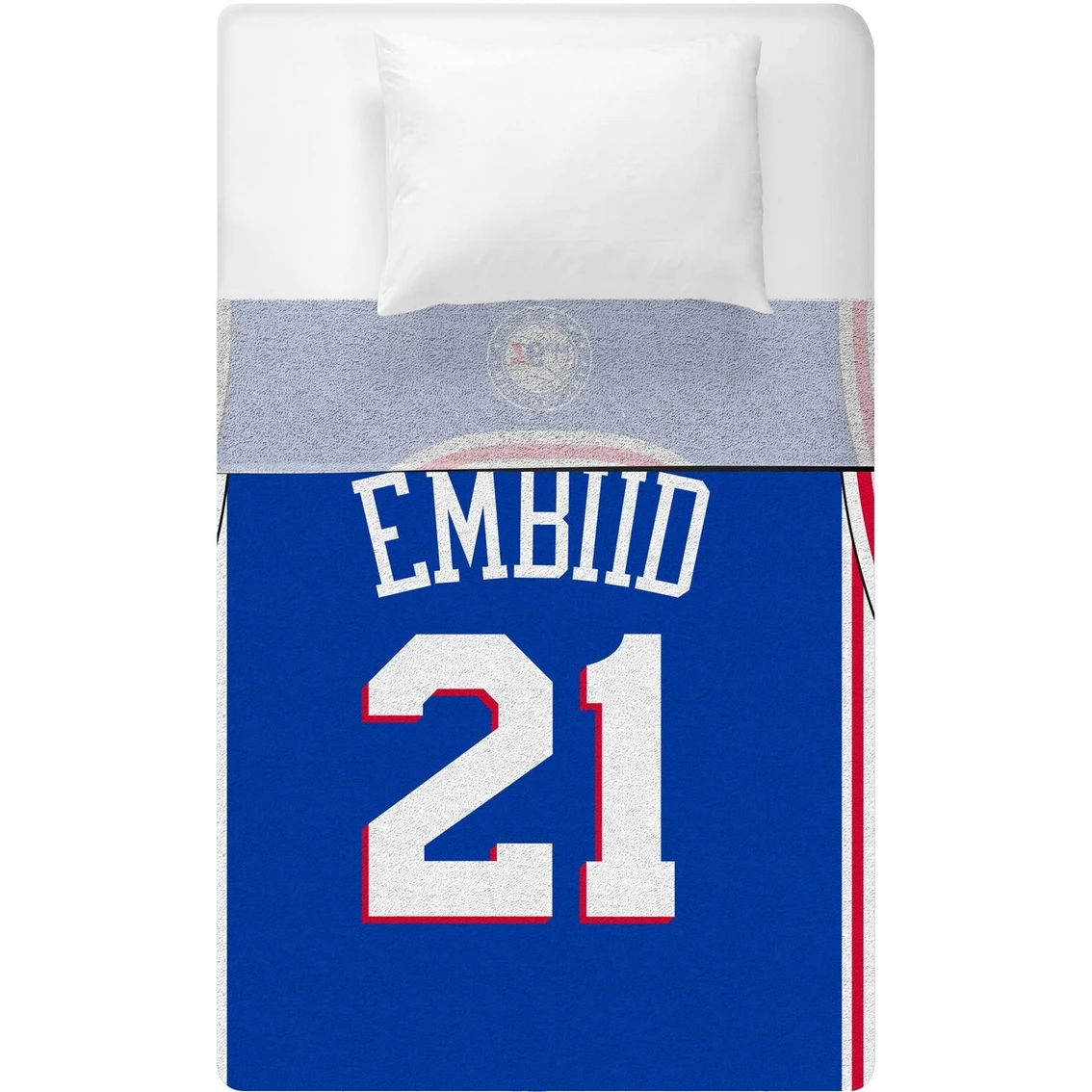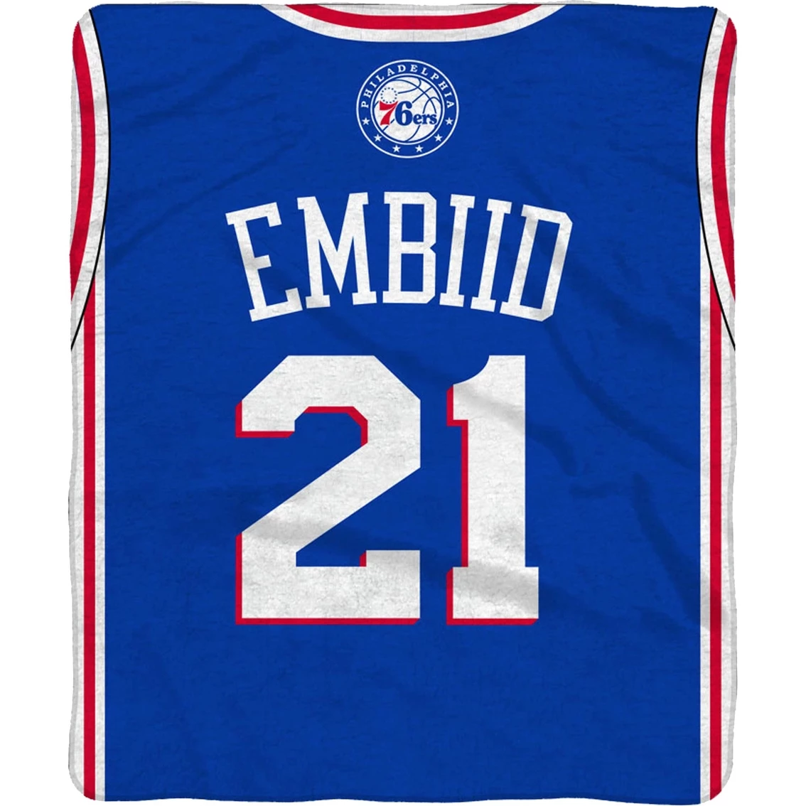 Great for chilling on the couch while watching the Philadelphia 76ers, this Joel Embiid jersey throw blanket is 60 in. x 80 in. and made with super-soft Raschel knit with a soft and luxurious feel. The size can allow this throw to be used as a twin size bedspread. Made with 100% polyester, it is machine washable and is officially licensed by the NBA, NBA Players and the Philadelphia 76ers. Sleep Squad player jersey blankets feature a dynamic graphic design with authentic logos from the team style guides. Model: T8-NBP-76R-JEM.